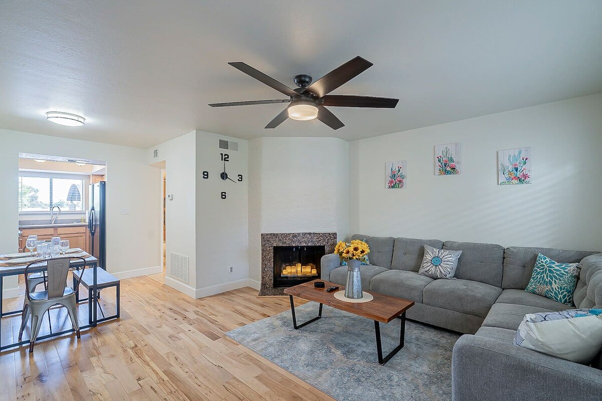 El espacio: Bienvenido a Palm Paradise, tu relajante refugio en el corazón del casco antiguo de Scottsdale. Renovado en octubre de 2024, este condominio combina un elegante diseño desértico-boho con todas las comodidades del hogar, creando un espacio que es hermoso y funcional. Relájate en el acogedor sofá de pana verde, perfecto para dormir la siesta, o sal al balcón privado para presenciar las espectaculares vistas del atardecer sobre Camelback Mountain. Entra en el tranquilo dormitorio con una cama tamaño king y sábanas de alta calidad.