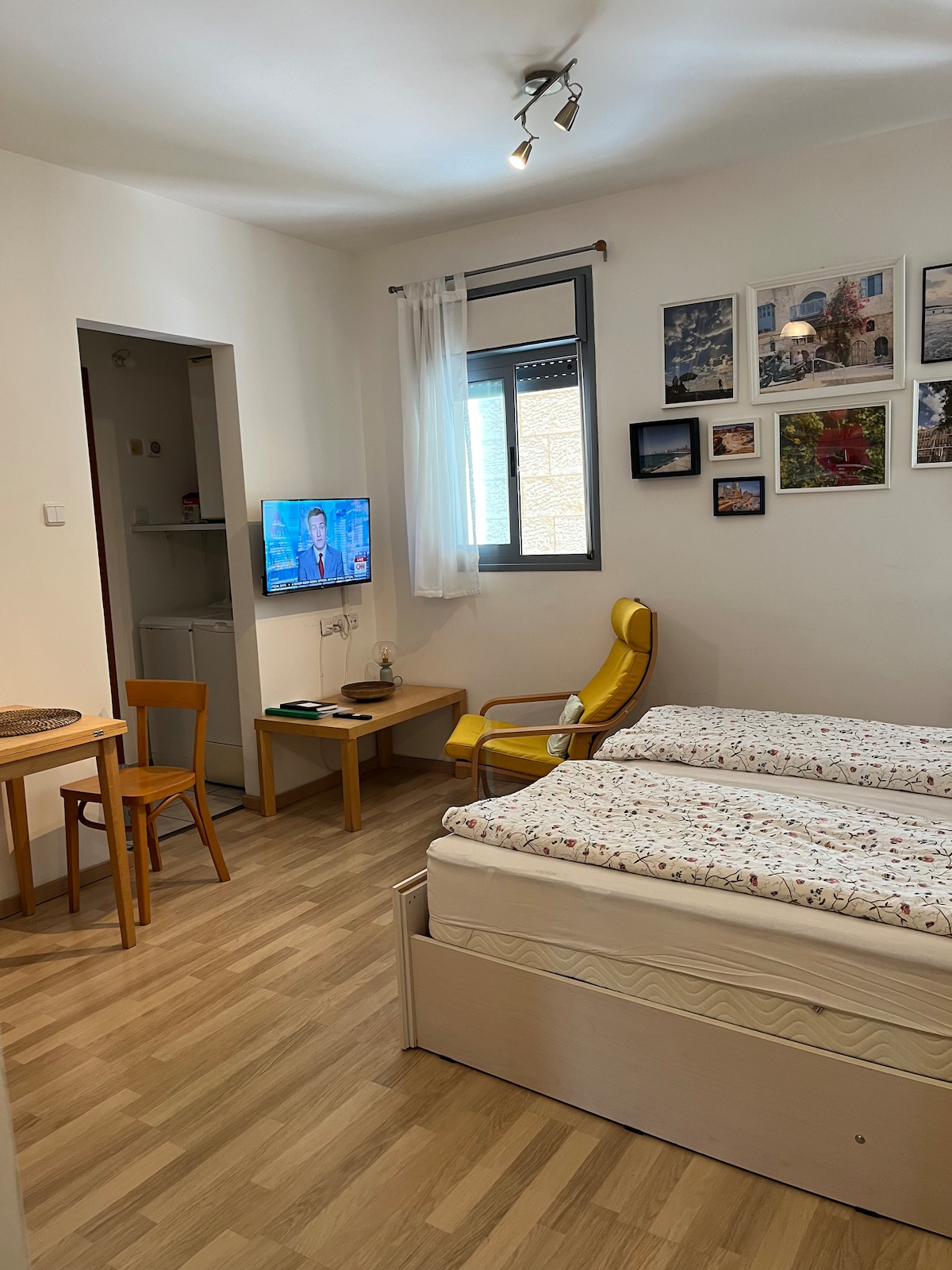 Un apartamento estudio agradable y luminoso con un bonito balcón grande, cómodamente ubicado en el centro de Ra'anana, a pocos pasos de la calle principal, Ahuza. El departamento contiene una cama doble (tamaño: 160 x 190 cm) y cocina pequeña, TV por cable por cable, espacio de trabajo con cable LAN y wifi. Se proporcionan ropa de cama y toallas adicionales previa solicitud. El anfitrión es un israelí nativo y habla con fluidez inglés y español.