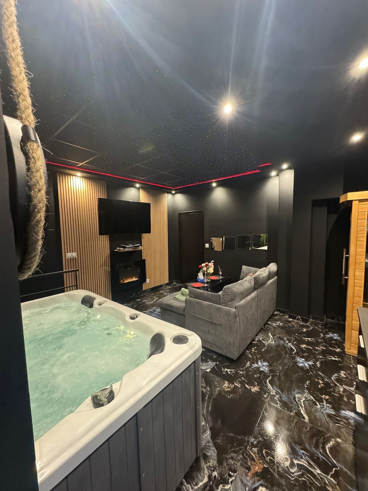 ❤️🔥 Descubre el lujo Love Room de TERCIOPELO y CUERO a 20 minutos de París, ¡perfecto para una escapada romántica y sexy! Baño de💎 hidromasaje, sauna privada, cama tamaño king con efecto nube, barra de striptease, sofá tántrico, etc. 💋 Explora nuevas sensaciones y crea recuerdos inolvidables juntos en el espacio secreto de la sala de juegos BDSM increíblemente equipada Cine 🎬 de 92pulgadas frente a la cama con Netflix, Prime Vidéo, Disney+, Spotify 💫 ¡Escápate a un refugio de paz y lujo para disfrutar de una experiencia única e inolvidable!