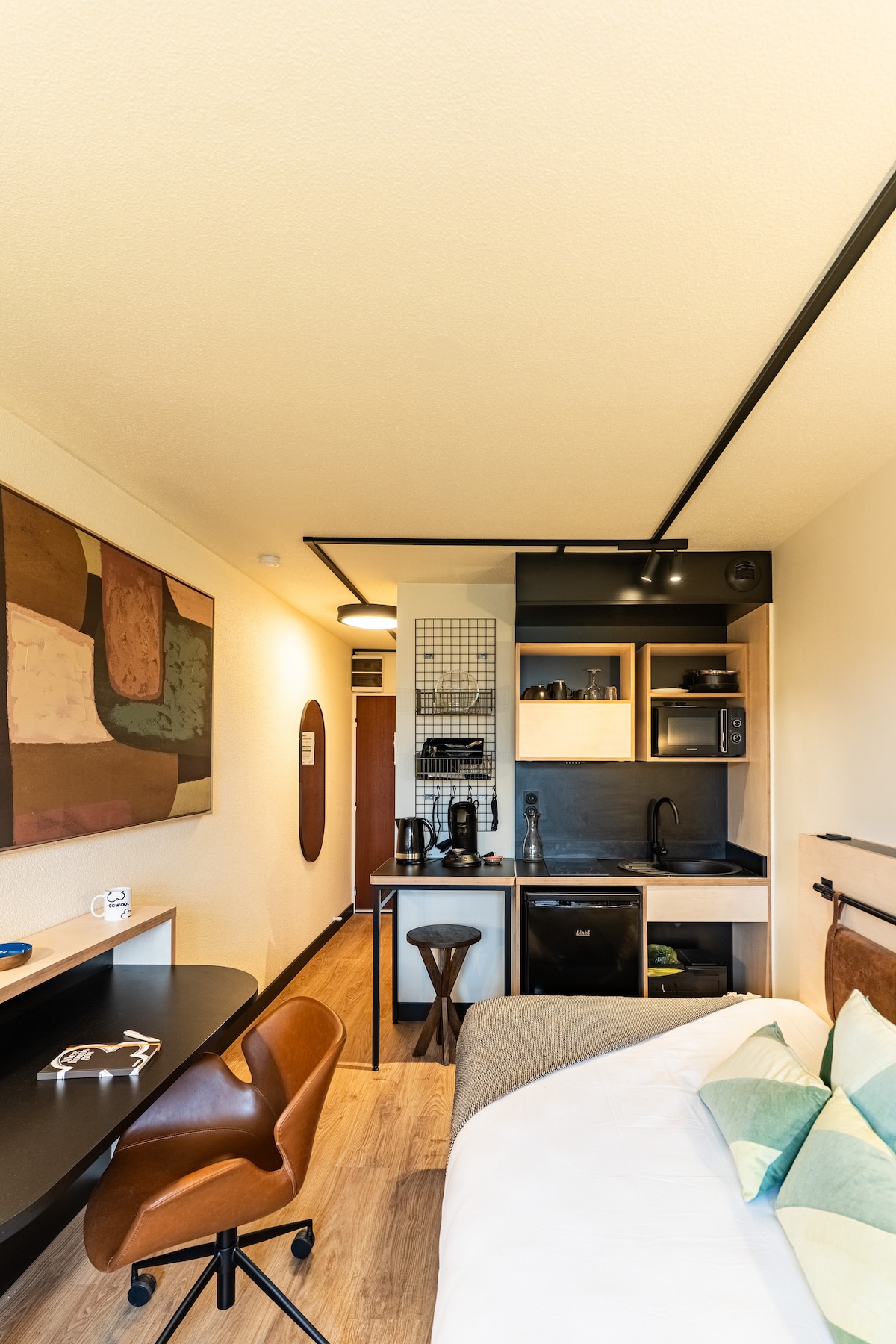 Con vistas a nuestro impresionante patio interior y a la encantadora iglesia vecina, tu pied-à-terre ofrece vistas abiertas, luz natural increíble y tranquilidad absoluta, en el corazón de París. Cada departamento incluye una sala de estar con sofá cama, un comedor con una mesa redonda, un hermoso dormitorio con una cama de lujo de calidad hotelera, una cocina abierta totalmente equipada con lavavajillas y lavadora-secadora, un baño con ducha y un inodoro separado.