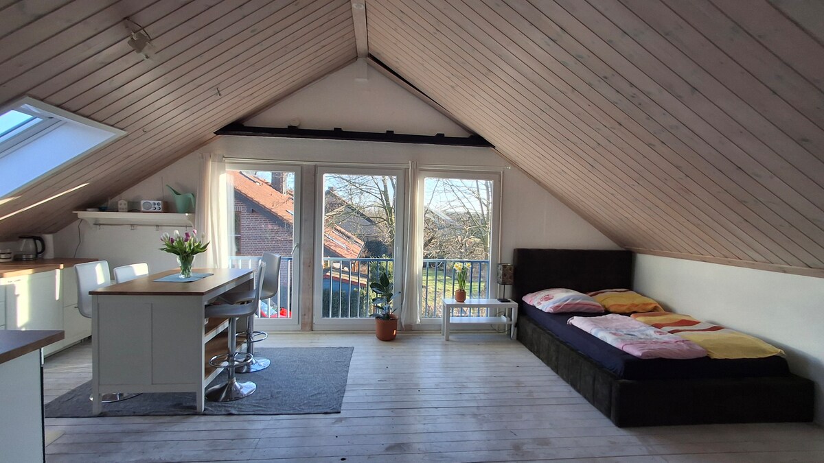 Alquilamos nuestro apartamento en el ático en el tranquilo barrio de Sentrup. El lago Aasee se encuentra a poca distancia a pie. A pesar de la ubicación urbana, es muy verde, en lugar de ruido de la calle se oye el canto de los pájaros. Hay una pequeña cocina con zona de cocina, un baño, así como una zona de dormitorio/ sala de estar. Estas tres habitaciones son para vosotros solos. Se llega al centro de la ciudad en pocos minutos en bicicleta o en autobús.