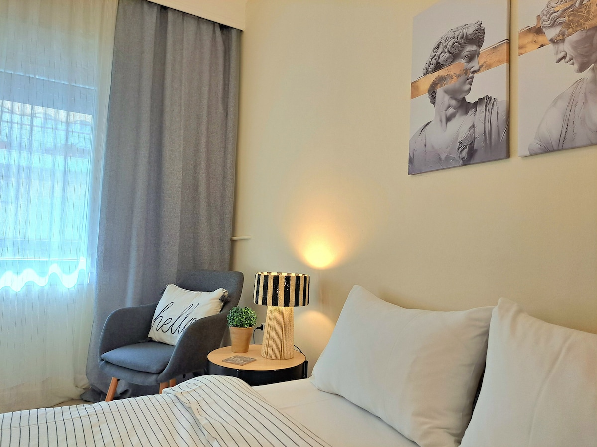¡Un apartamento artístico, limpio, totalmente renovado y totalmente equipado que ofrece momentos de bienestar y relajación después de un día intenso! Comodidades populares: - Asiento de masaje de estado de la técnica - Ubicación centralizada. - Cocina y baño totalmente equipados. - Wifi rápido. - Calefacción y refrigeración individuales. - Agua caliente 24/7 y agua potable filtrada - Ropa de cama superior - Balcón con hermosas vistas. - Frigorífico, horno, lavavajillas, lavadora, cafeteras, 2 televisores inteligentes, plancha, secador de pelo, pantuflas, cuna, estacionamiento fácil.