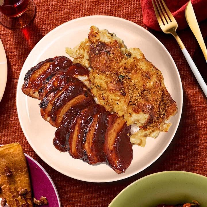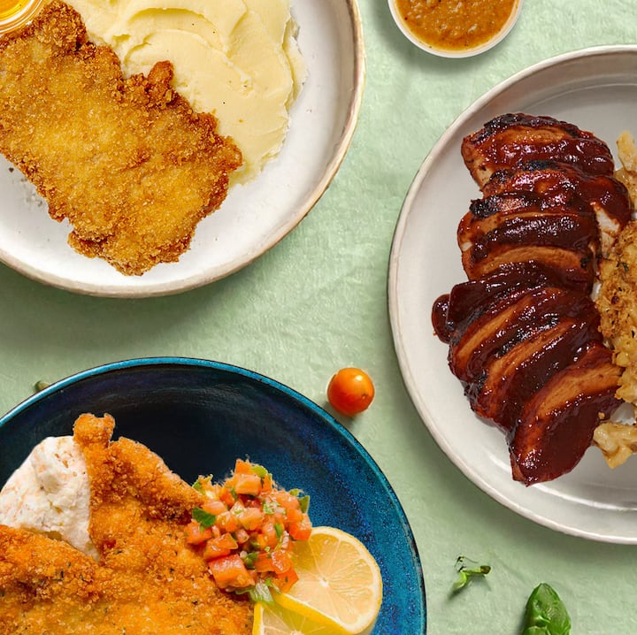Prueba los éxitos del chef Chris Ratel con su pollo a la barbacoa (salsa barbacoa dulce y ahumada, pollo desmenuzado, macarrones y queso pegajosos), pollo frito sureño (frotado de especias exclusivo, patatas cremosas con suero de leche y un chorrito de miel caliente) y schnitzel de pollo dorado (puré de papas con mostaza, ensalada de tomate con limón mezclada con perejil y cebollines). Incluye 1 de cada comida.