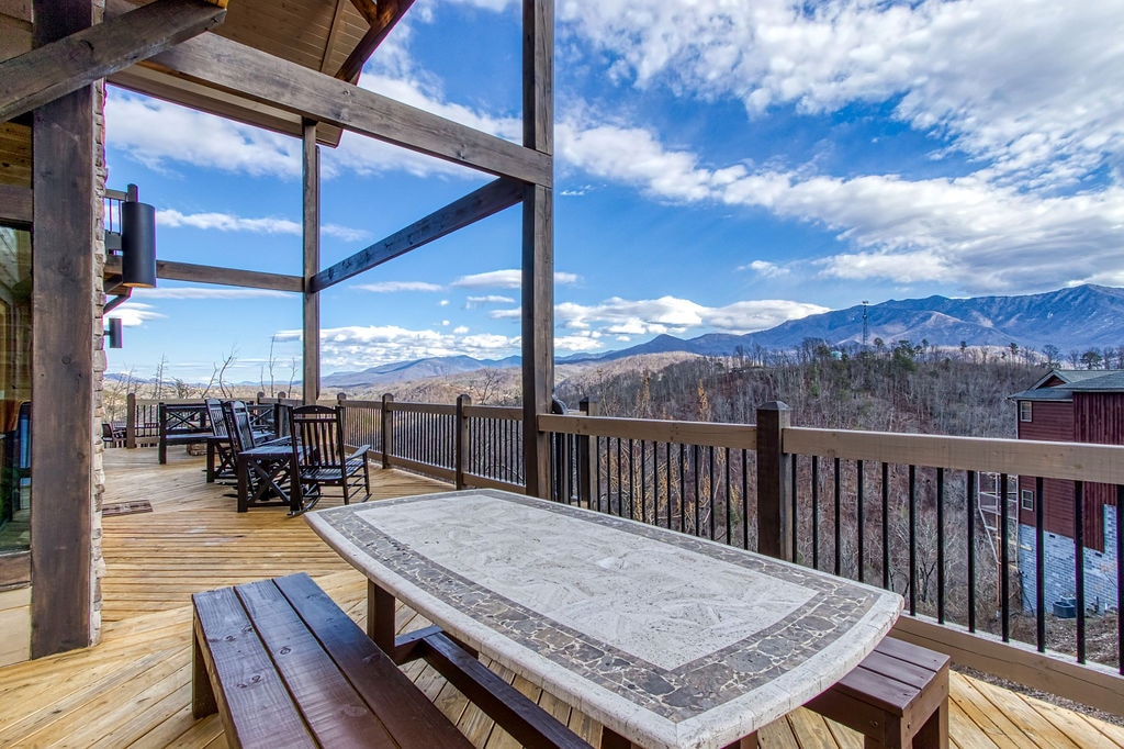 Smoky Mountain Mansion is an AMAZING cabin with 180 DEGREE VIEWS of the Smoky Mountain area that have to be seen to be believed. It has three decks that overlook the nearby hills and valleys, making you feel like a king of the Smoky Mountains. Two of the decks have private hot tubs and the top deck has a great wooden swing. It's a fantastic place to grab your morning coffee or relax and watch the sun go down after a long day.