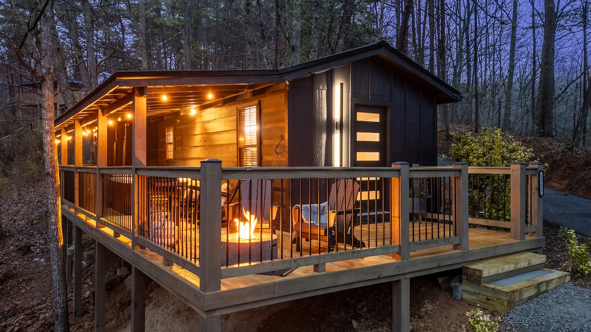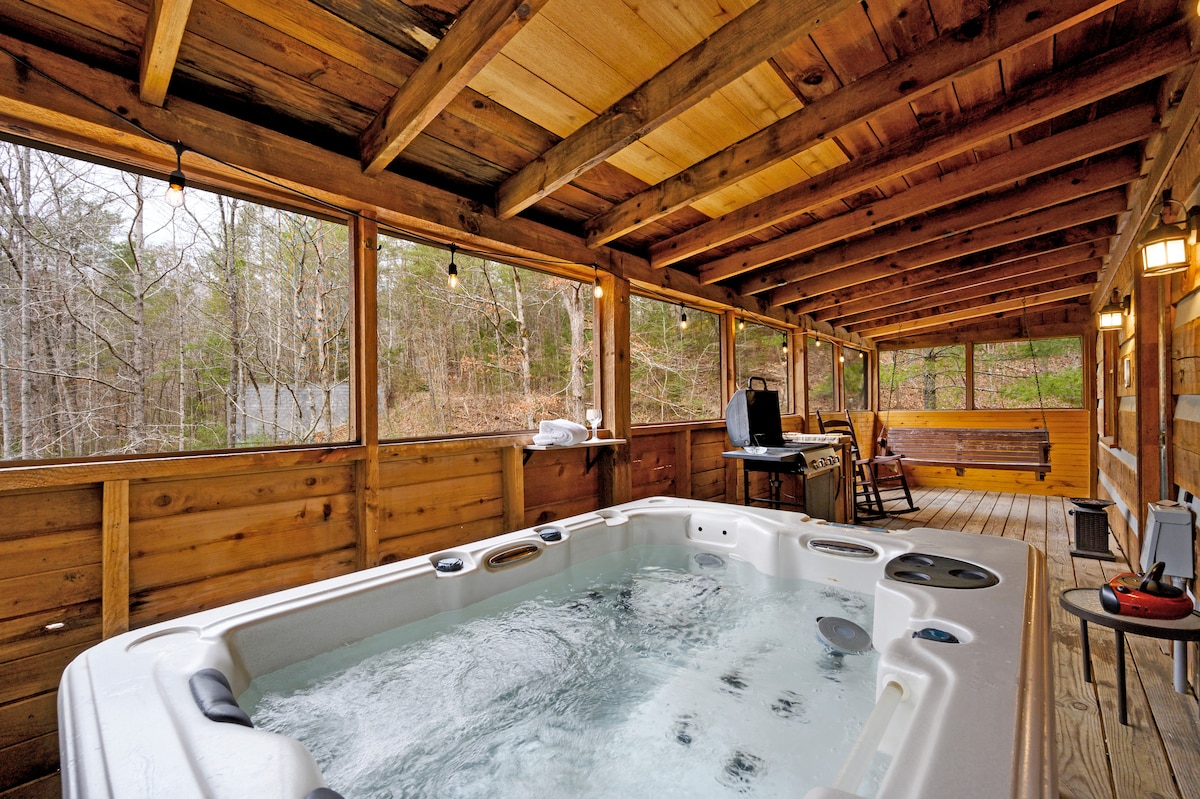 Esta aislada cabaña de un dormitorio ofrece la máxima privacidad y hermosas vistas arboladas. Los servicios incluyen un jacuzzi privado y una sala de juegos, una gran terraza con zonas de comedor al aire libre y una nevera de tamaño completo, lavadora/secadora, lavavajillas, horno/cocina y TV inteligente. La cabaña se encuentra a solo 5 minutos del centro de Pigeon Forge y a 15 minutos de Gatlinburg, recientemente renovada e inmaculada. Ten en cuenta que la cabaña está en las montañas y la entrada es empinada, se recomienda un 4x4, pero no es obligatorio.