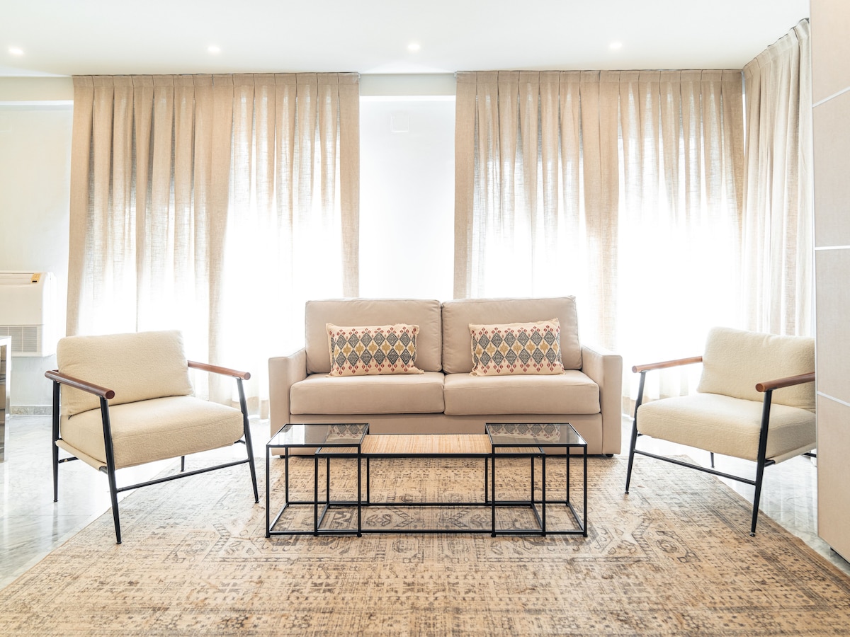 Este apartamento de 83 metros cuadrados es ideal para un máximo de 6 personas. El espacio cuenta con cómodas camas tamaño king (180x200) y queen (160x200), una amplia sala de estar y una colorida terraza privada. La sala de estar evoca el ambiente mediterráneo, gracias a los cálidos colores de los muebles y las mesas de comedor de madera. Para mayor comodidad, túmbate en la terraza privada, sostén una copa de tinto de verano y disfruta de las cálidas noches sevillanas. El apartamento también incluye una cocina equipada y un baño espacioso.