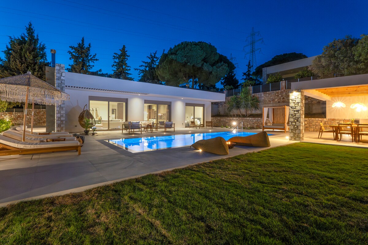 Villa de lujo con piscina de nueva construcción (totalmente climatizada y con ventiladores de techo) Una impresionante villa de lujo de 150 metros cuadrados ubicada en un exuberante jardín verde en la pintoresca ciudad de Ialyssos, a solo 7 km del aeropuerto y de la ciudad de Rodas. A solo 5 minutos a pie se encuentra la hermosa playa de Ialyssos, donde podrás explorar excelentes bares, restaurantes, servicios de alquiler de coches, supermercados, una estación de taxis y mucho más. Relájate junto a nuestra piscina, ya sea tomando el sol por la mañana o disfrutando de una copa por la noche.