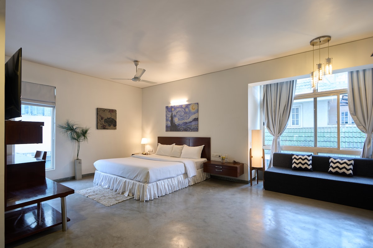 Un apartamento estudio en la azotea con vistas al parque Cubbon y al estadio Chinnaswamy (donde juega RCB). Este alojamiento es perfecto para parejas y profesionales que quieren estar cerca del centro de Bangalore. El dormitorio y la sala de estar están en un espacio continuo, con grandes ventanales que te dan mucha luz natural, así como una gran vista llena de verde. Hay una pequeña cocina pequeña para recalentar y almacenar alimentos, y un baño espacioso. ¡Esperamos que disfrutes de este espacio único tanto como nosotros!