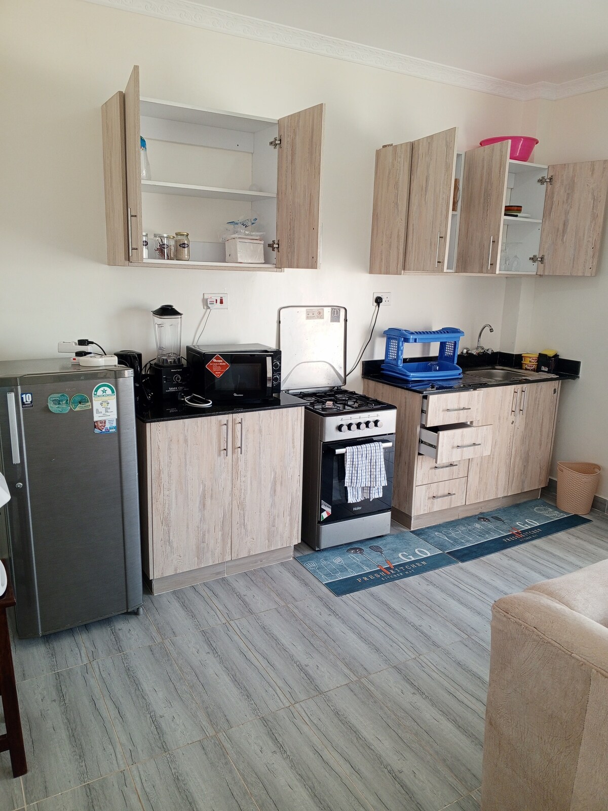 Disfrutarás de fácil acceso a todo desde este lugar céntrico. Fácil acceso a la playa, lugares para comer, varios restaurantes, los mejores hoteles de playa, incluidos Serena, Flamingo y Pride Inn, una piscina con servicio y ascensor. A 15 minutos en coche del centro de Nyali. Apartamento decorado con buen gusto en un barrio tranquilo y sereno con comodidades modernas y servicios de limpieza.