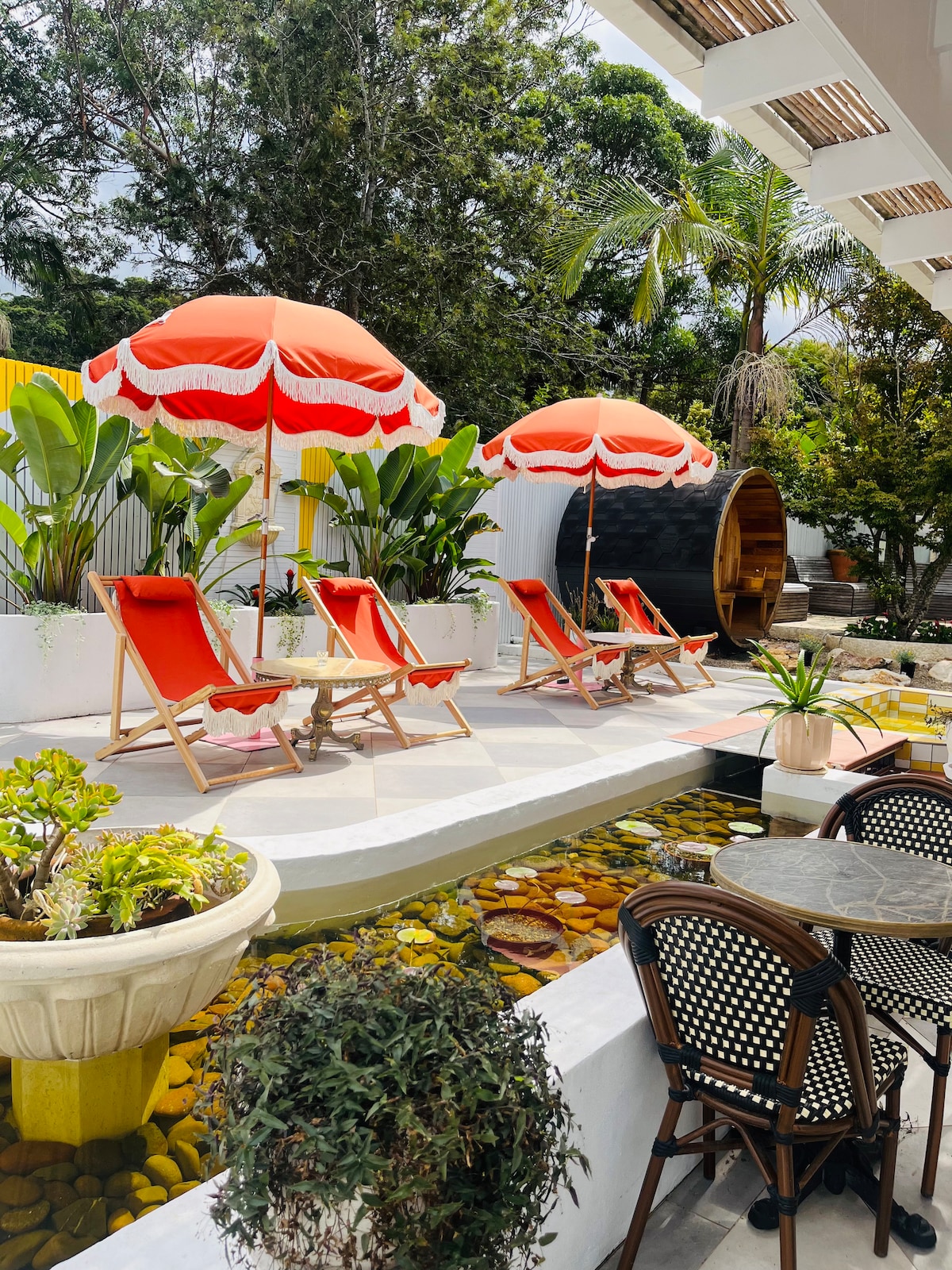 Welcome to Burrill Bungalow — a couples retreat for those who love relaxed coastal living. Privately tucked behind our home and surrounded by tropical palms, this freestanding studio features an open-plan layout with bifold doors that open to the garden for effortless indoor–outdoor living. Enjoy a king bed with beautiful linen, a spacious bathroom, and an outdoor bath set amongst the garden — perfect for stargazing. A private patio is ideal for yoga or quiet relaxation.