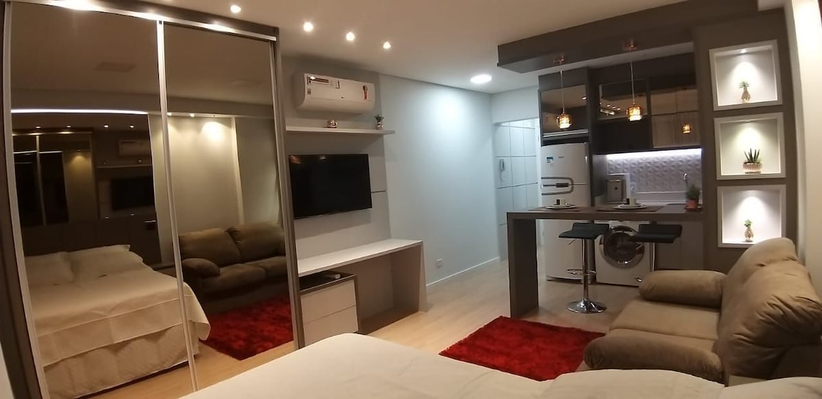 Estudio moderno, nuevo, acogedor, ubicación perfecta, con una hermosa vista desde el balcón, especialmente por la noche. Wifi rápido, escritorio, TV inteligente de 55”, cama Queen. Aire acondicionado (frío/calor). Lavadora y secadora y una hermosa isla en la cocina. 50m2 de mucho estilo-27ºandar, Silencioso. En el Centro/Batel, cerca de comercios, bancos, centros comerciales, polo gastronómico y Hospital. En el edificio: piscina, gimnasio, sala de juegos, sauna, jacuzzi, conserjería las 24 horas.