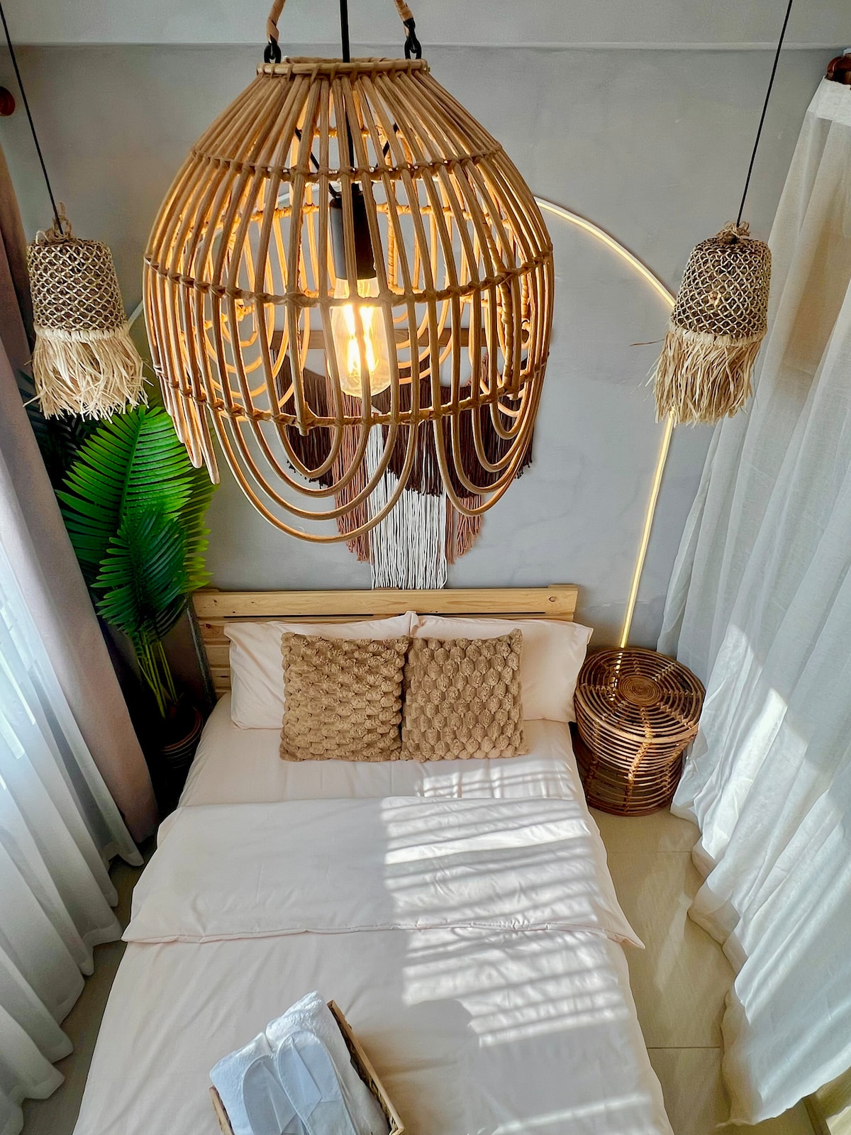 ¡Queremos que AR Home sea tu hogar! Siéntate, relájate y siéntete como en casa en nuestra acogedora morada de inspiración rústica-boho-balinesa. ¡Decorado con luces que crean un ambiente acogedor y cálido donde cada luz crea un ambiente perfecto! ¡Pintoresco balcón con vistas a la ciudad y un dormitorio increíblemente único para un merecido descanso al final del día! Ubicación: Shore Residences, Torre D, Mall of Asia, Pasay, 1300 Manila, Filipinas – Hora de llegada: 3:00 p. m. Salida: estrictamente a las 12:00 h.