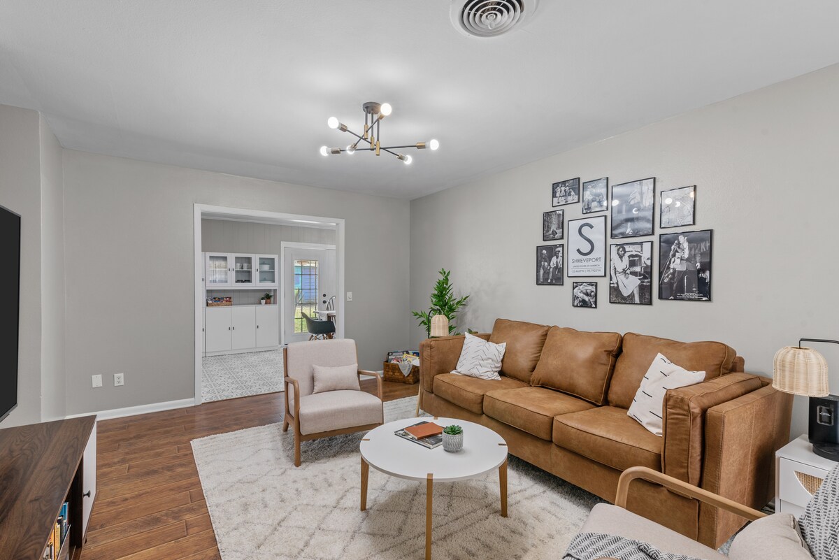 Esta casa recién reformada de 2000 pies cuadrados es perfecta para una escapada de vacaciones. Los huéspedes pueden relajarse junto a la gran chimenea de ladrillo con una taza de café (de nuestro bar de café especial) o dirigirse al patio trasero para tostar smores junto a la chimenea. Se encuentra en una parcela esquinera con pacanas maduras y cuenta con una fabulosa cocina de concepto abierto/sala de estar. Está a 5 manzanas de las tiendas/restaurantes más exclusivos de Shreveport, a 2 millas de Brookshires Arena. Ideal para viajes familiares/viajes de negocios/invitados a bodas.