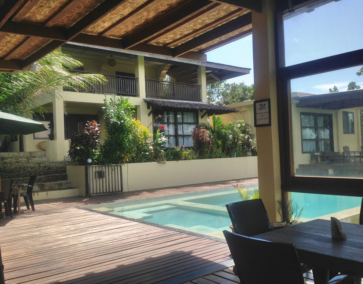 Villa privada, tranquila y elegante con piscina en la cima de una colina. ¡Excelente ubicación! A 5 minutos de la playa de surf y nube nueve, y a poca distancia de General Luna. Hay muchas opciones gastronómicas cerca. El complejo de 3 plantas de Villa Maya ofrece 5 suites grandes con capacidad para hasta 18 personas. Piscina infinita, buena comida, excelentes vistas y campo de golf privado de par 3. Todo ello a poca distancia y con fácil acceso a la playa y al centro.