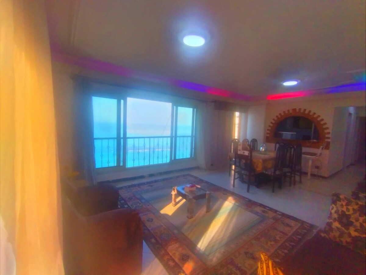 Situado en el área deportiva de Alejandría, este lujoso apartamento único de 2 dormitorios frente al mar con increíbles vistas donde la belleza del Mediterráneo ocupa un lugar central, cerca de todas las atracciones. - 2 dormitorios cada uno con cama Queen. - Salón: sofá con un juego de 3 plazas (convertible en cama), espacio abierto conectado a un comedor integrado. - Balcón: balcón de 14 metros cuadrados con vistas panorámicas del Mitterrandian es el lugar perfecto para ver la puesta de sol. - Baño de vanguardia y cocina moderna