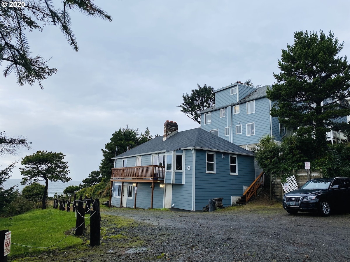 Our most popular 1 bedroom ocean view suite #10 w/ kitchen & wood burning fire place in unique, vintage, rustic ocean front boutique motel 75 ft. elevation above sea level on a cliff, in quite residential neighborhood away from traffic, yet close to everything in the heart of Lincoln City - short drive or walk to the beach Canyon Dr. Ocean Front Park is right below us. To assure safety and security of our guests to we have Surveyance system outside in parking areas and points of access to units.