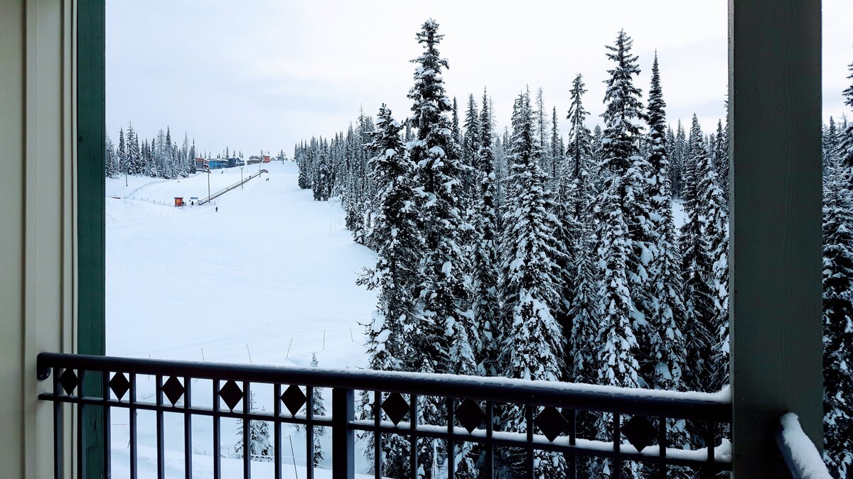 Ubicado en Silver Star Resort en la cima de la hermosa montaña Silver Star en Vernon, BC Canadá... desde el balcón del apartamento, miras directamente a la colina de esquí Silver Queen... también puedes ver Tube Town y la entrada al sendero de campo traviesa... ponte los esquís justo afuera de la puerta del vestuario y esquía directamente al telesilla y desde allí puedes llegar a cualquier pista de esquí en la montaña... cuando hayas terminado, esquía de regreso a la puerta del vestuario.