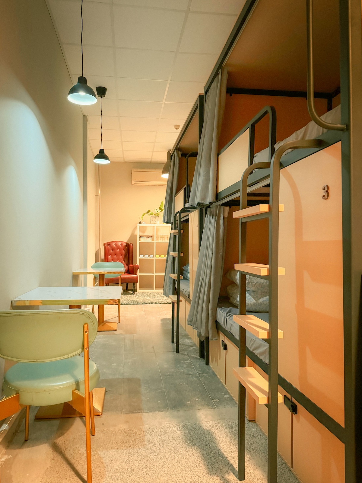 Somos un hostal de convivencia ubicado convenientemente en el área de Lavender/Kallang. Cápsula tipo habitación (7 metros cuadrados) para 2 personas. Hay aire acondicionado fuerte disponible dentro de la cápsula de la cabina. Los baños, el salón y el área de despensa son compartidos y se encuentran fuera de tu habitación. La cabaña es privada y accesible con tarjeta de acceso. Cama Queen+Individual, caja fuerte, zapatillas, kit dental y toallas disponibles en la cápsula. Los tapones para los oídos están disponibles a pedido. 3 MRT (cerca): Bendemeer (azul)/Lavender (verde)/Farrer Park (morado).