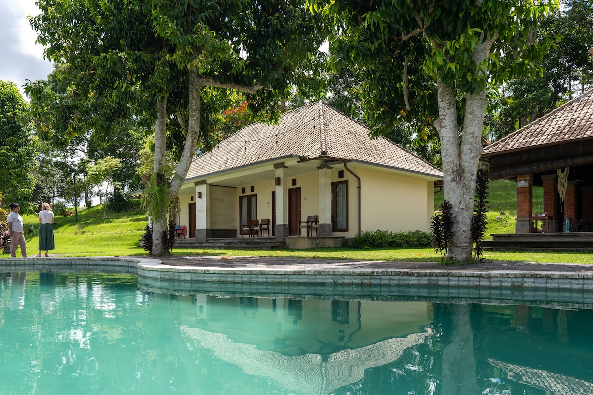 Relax in our Deluxe Room, offering a comfortable bedroom, private bathroom, and a balcony with breathtaking mountain views. The room features a cozy seating area and a dedicated workspace, ideal for both relaxation and productivity. Enjoy a complimentary breakfast and access to the resort’s shared pool. Guests can also explore the on-site amenities, including organic dining, yoga pavilions, a spa, and cultural activities like temple tours and farming lessons for a truly enriching stay