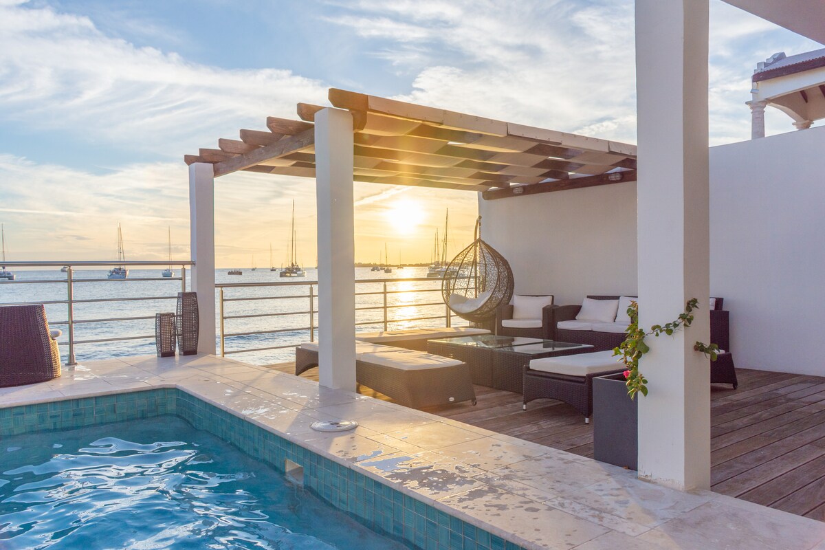 Una suite de condominio de lujo espaciosa y inmaculadamente limpia con pisos de mármol, cocina totalmente elegante con encimeras de granito y un gran balcón de azulejos de arcilla italiana con vistas al Océano Atlántico y al francés St. Barths, en una propiedad bien conocida en Dawn Beach.