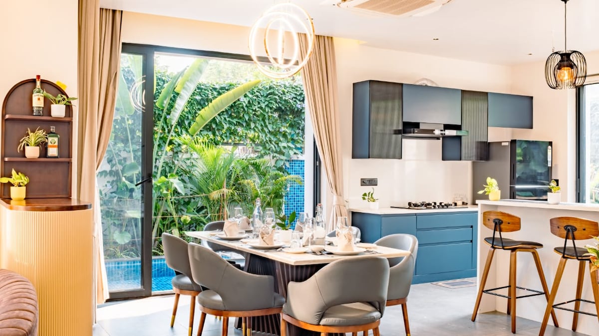 The BluJam Villa, Arpora is a beautiful lakefront 3BHK villa in North Goa with an infinity-edge private pool, offering stunning views of the lake(field during summer months), forest, & sunsets 5 mins to Baga, 10 to Anjuna & Calangute Stylish interiors, fully equipped kitchen, resident caretaker, 24/7 generator power backup, double parking space & serenity —all while staying close to Goa’s top beaches, cafes, nightlife, & attractions Perfect for families & friends - groups of 5, 6, 7, 8 &9