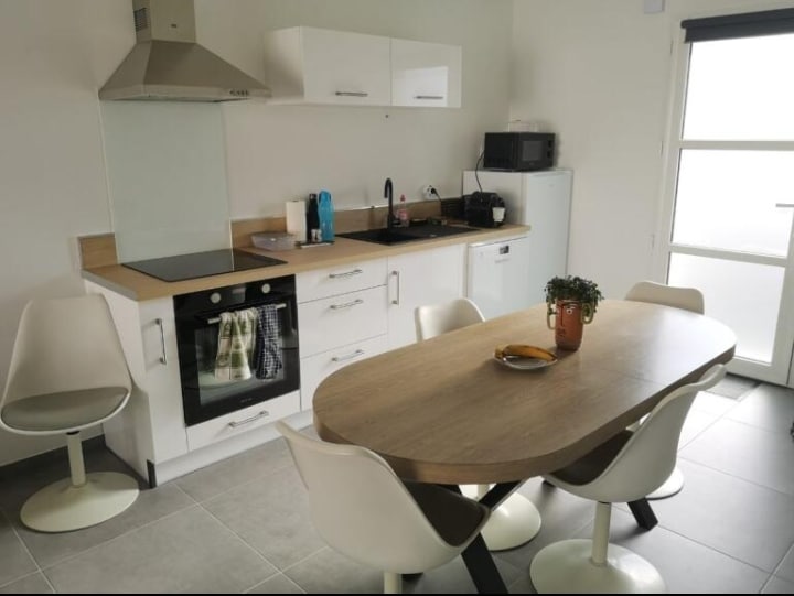 ALOJAMIENTO CLASE EN MUEBLE DE TURISMO ** Casa cómoda y con aire acondicionado, situada en el fondo del jardín del propietario, independiente, cerca de tiendas y restaurantes, a 900 m de la playa, el bosque y los carriles bici. (Vélodyssée). Le va a gustar mi alojamiento por el barrio, las zonas exteriores, la luminosidad y la tranquilidad. Listo para dos bicicletas. Posibilidad de alquilar sábanas y toallas por 18 euros. Gastos de limpieza de 30 euros opcionales A pagar a través del sitio web de Airbnb Wifi