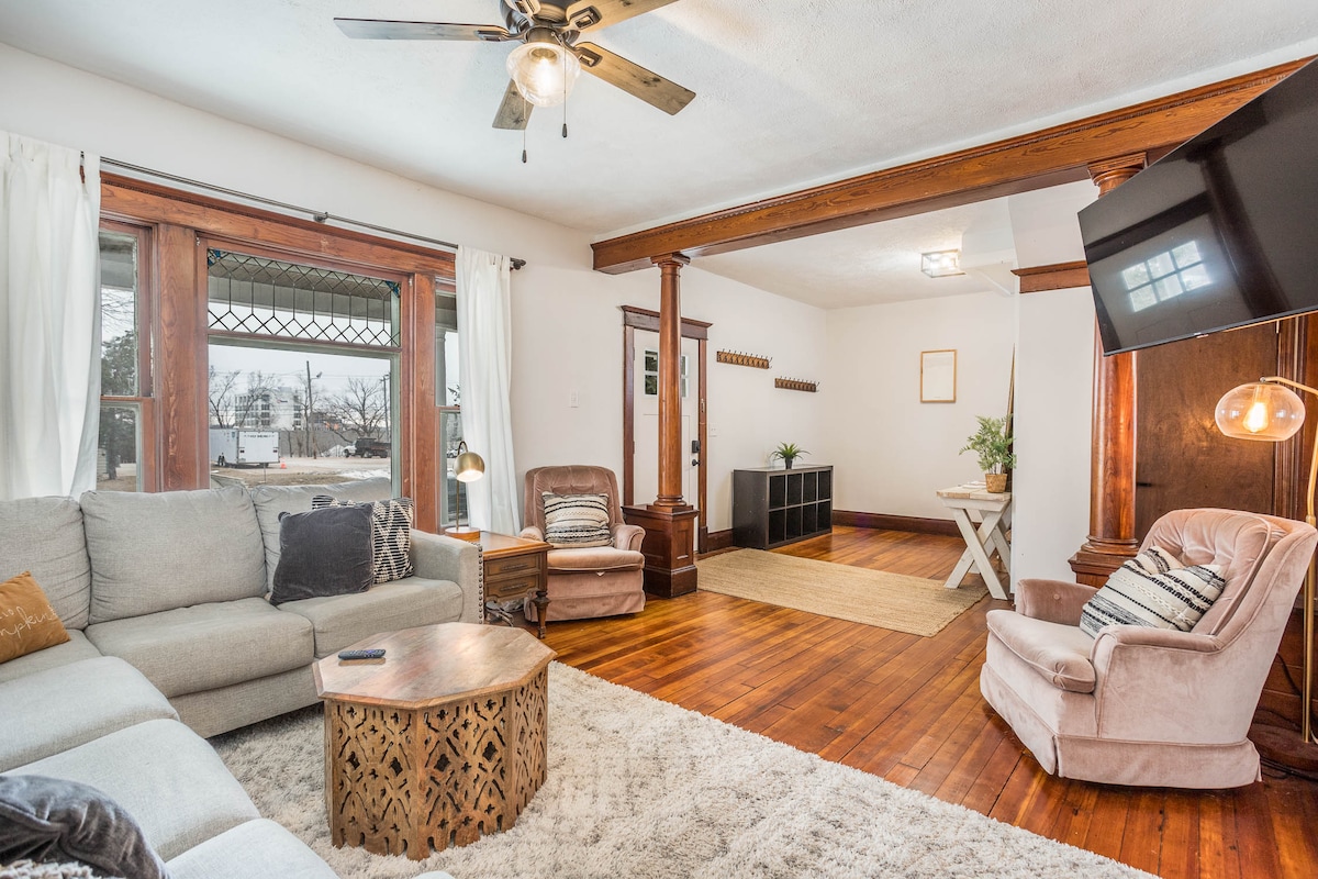 ¡La nueva vida se trae a este lugar de 100 años! Con detalles como amplios techos de 9 pies, una chimenea eléctrica para acomodarse y encimeras de cuarzo en la cocina. Equipado para una estancia cómoda, incluimos muchos servicios. 3 televisores Roku (inteligentes) con inicio de sesión para huéspedes Café y K-Cups. Crema y azúcar Papel de cocina Lavadora y secadora Tabla de planchar Toallas, ropa para lavar, toallas de mano Lavaplatos y detergente Ventiladores de techo (2) Camas tamaño queen (1) Cama extraíble completa Espejos