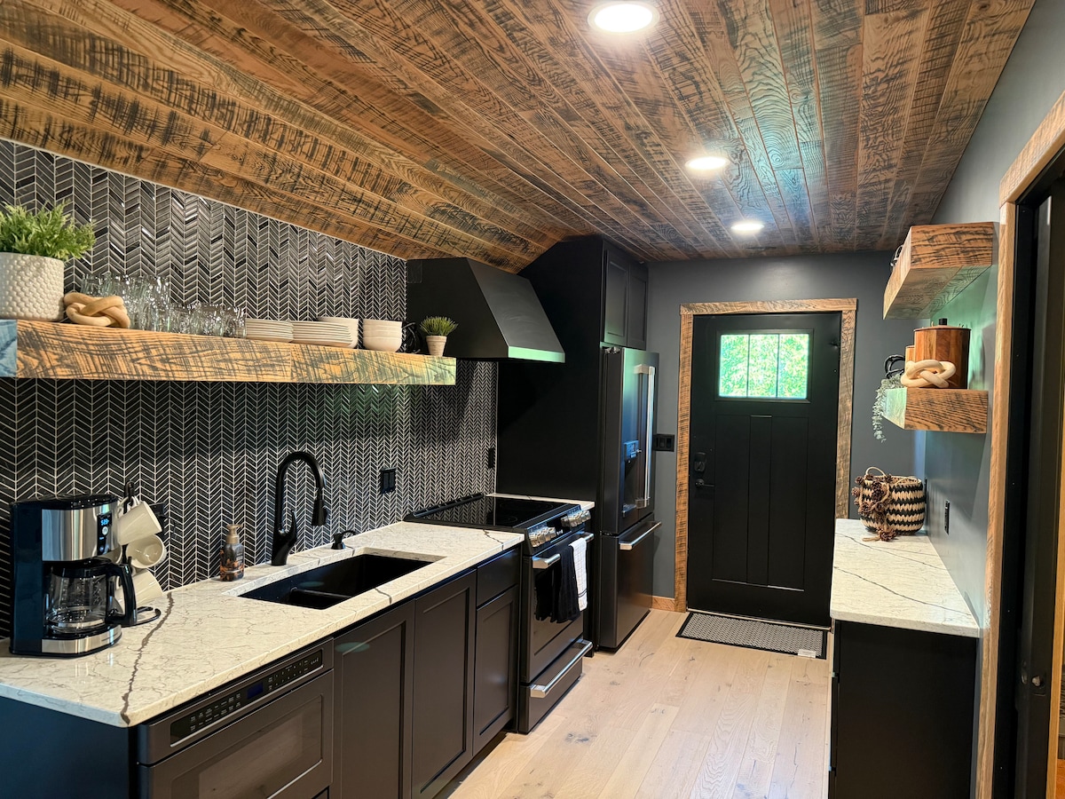 Bienvenido a The Midnight Hideaway, su escapada aislada al bosque diseñada para brindar un confort profundo y reparador.Esta cabaña te envuelve en un ambiente acogedor y melancólico, con paredes elegantes y oscuras, techos de madera y grandes ventanales que te llevan la tranquilidad del bosque directamente.El lujo está presente en cada detalle: los pisos de madera de tablones anchos están calefaccionados y los lujosos muebles de cuero también están calefaccionados y equipados con funciones de masaje.Acomódese junto a la chimenea y relájese lejos del ruido cotidiano.