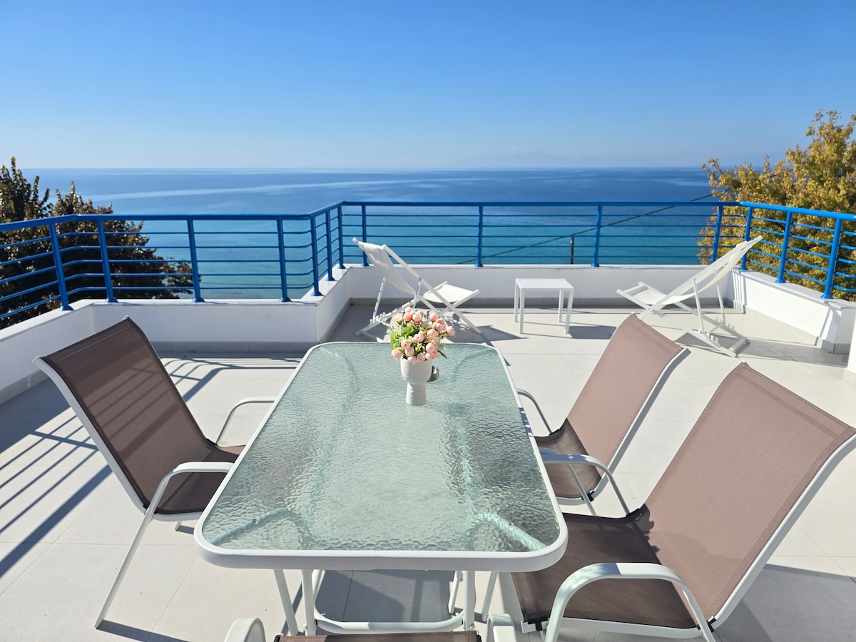 Τα διαμερίσματα είναι καινούργια, πρώτα στη θάλασσα, φωτεινά, με μεγάλα μπαλκόνια όπου υπάρχει τραπεζαρία, δωμάτιο με διπλό κρεβάτι και άνετο στρώμα, το δεύτερο δωμάτιο έχει κουζίνα, μεγάλο ψυγείο μεγάλη ντουλάπα τηλεόραση και άνετο καναπέ-διπλό κρεβάτι και θέα την θάλασσα και πολύ πράσινο. The flat is brand new, at the sea front, spacious, lot of sunlight, with big balcony and table set and chairs. It has a large double bedroom, and second double bedroom with kitchenette, TV, and sea view.