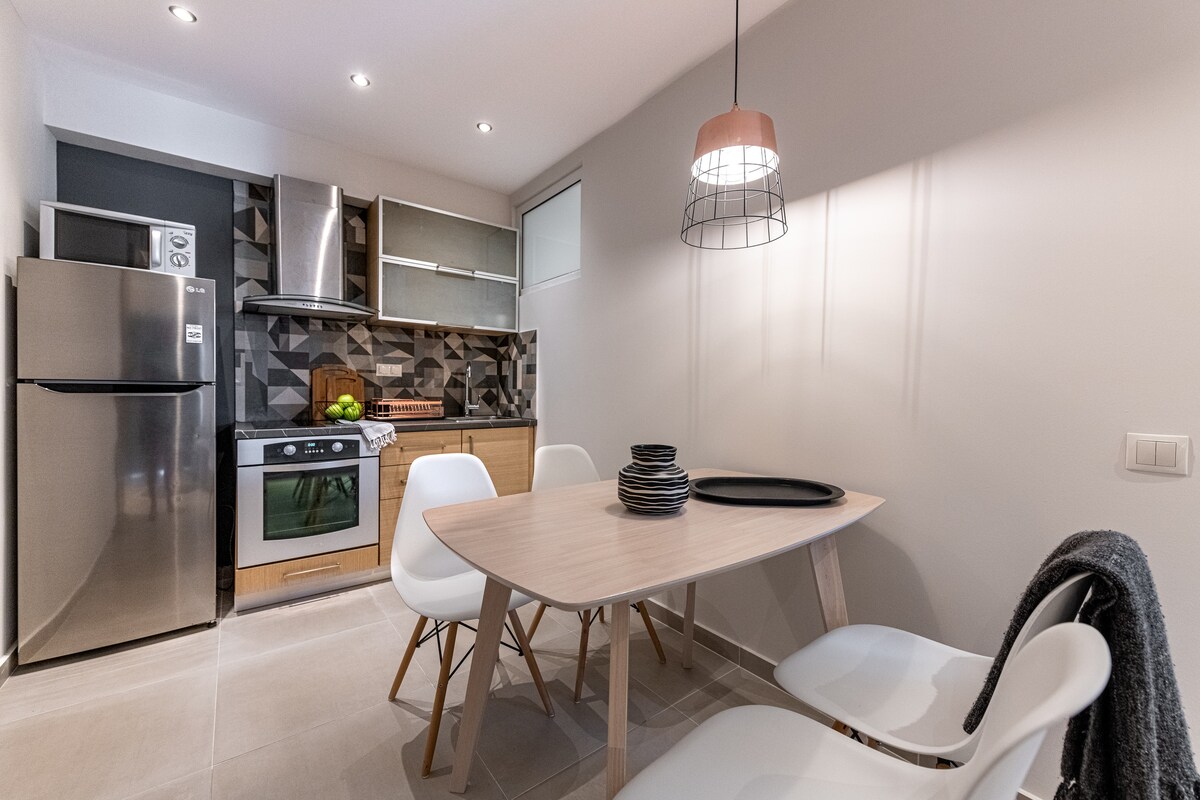 Nuestros apartamentos con capacidad para 4 personas constan de 2 dormitorios separados con una cama doble y 2 camas individuales, cocina totalmente equipada que incluye una lavadora para tu comodidad. Cada apartamento tiene un balcón privado, aire acondicionado, TV inteligente, Wifi, caja fuerte y aparcamiento privado seguro. Situado perfectamente para facilitar la exploración de nuestra isla. Dajon está a 10 minutos a pie del centro principal de la calle Papadiamantis.