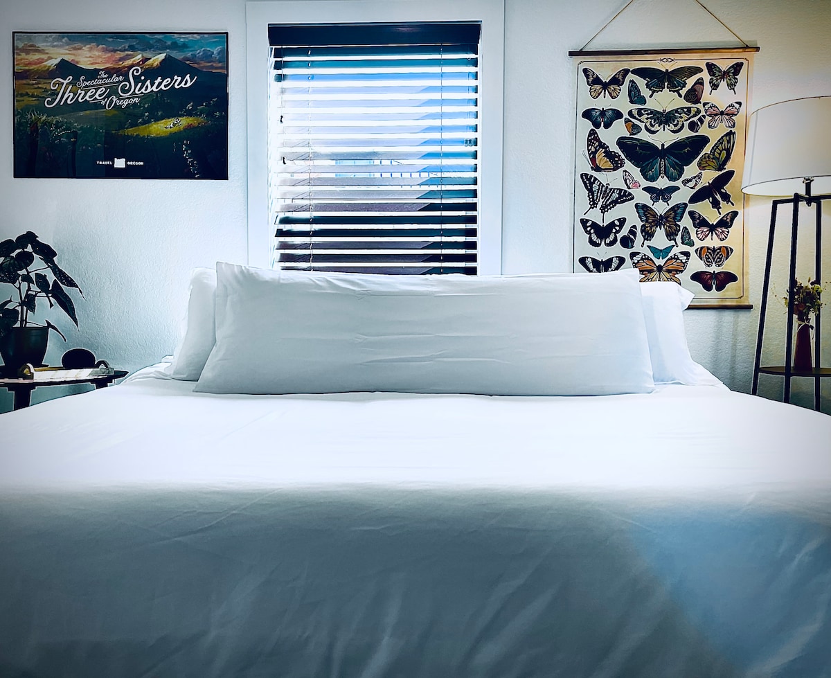 Disfruta del estilo y la comodidad de este nuevo escondite ubicado en un barrio tranquilo y céntrico a solo 3 minutos de las tiendas y restaurantes del Oakway Center y a solo 7 minutos de la Universidad de Oregón. Disfruta de tu tiempo fuera y luego vuelve a casa para relajarte con todas las comodidades en medio de un interior limpio y elegante. O desahógate poniendo tu disco de vinilo favorito, atenuando las luces y sumergiéndote en tu bañera gigante para dos personas. 10 % de descuento por reservar la opción no reembolsable.