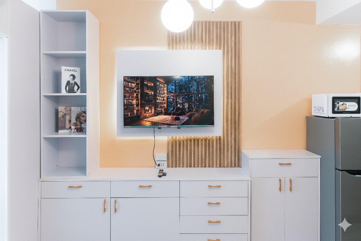 Enjoy our luxury home concept that connects all the guests in an incredible way. The functionality of the kitchen, dining, bedrooms among others is extremely gracious and fully air conditioned. The cinematic hotel experience with videoke in a staycation right in the heart of Makati. Chill and relax in a fully furnished master suite with Lazy boy and en suit jacuzzi! SUPER CONVENIENT! Bowling, billiards, massages, an authentic Korean sauna, resto bar and lively karaoke—all within a 3-min walk!