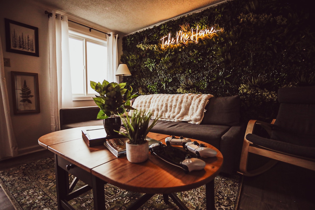 ¡Lo moderno se une al encanto del viejo mundo en este apartamento recién reformado de Highland House! ¡Disfruta de una unidad fabulosamente equipada con muchos detalles únicos de madera de granero! La cocina incluye nevera de tamaño completo, lavavajillas, microondas, tostadora, cafetera, placa de inducción y una mesa plegable para dos. La cama tamaño king de espuma viscoelástica es increíble y, a 14 pulgadas del suelo, tiene la altura perfecta para guardar el equipaje que no utilices.
