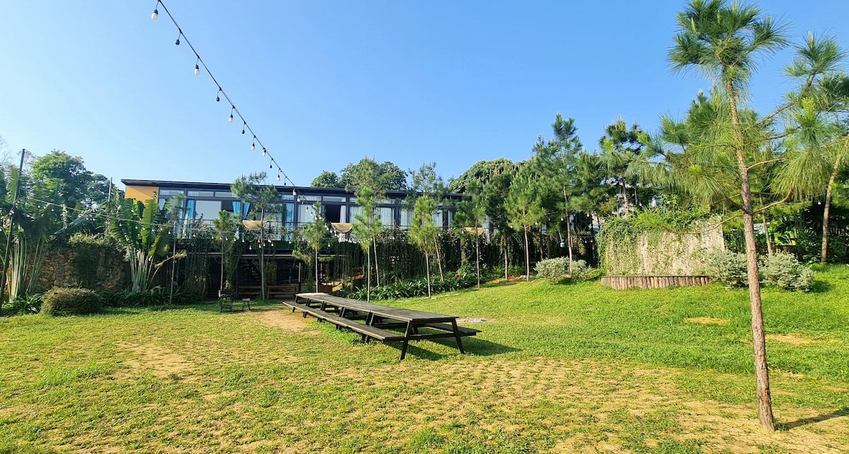 The Big Pine House está justo frente a la ladera de la colina, el antiguo bosque de pinos circundante trae un ambiente fresco durante todo el año para Homestay. La casa también posee una vista frontal extremadamente espaciosa cuando la pared de ladrillo se reemplaza por una pared de vidrio endurecida transparente, sin restricciones de visibilidad.