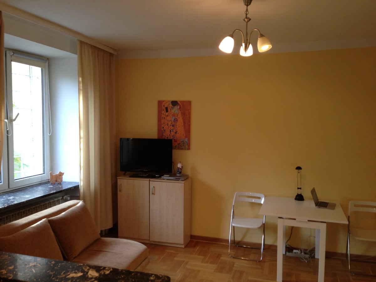 Un hermoso y espacioso estudio en el casco antiguo. Este estudio se encuentra en un barrio agradable con pubs y restaurantes cerca, y a solo 150 metros de la Ruta Real. Totalmente renovado en 2013, nuestro estudio tiene capacidad para 2-4 viajeros (una cama doble tamaño king y un sofá cama adicional). Cocina totalmente equipada que incluye cafetera, hervidor de agua y utensilios para cocinar. También ofrecemos mapas, guías y otros materiales para ayudarte a orientarte en Varsovia. Wifi, Apple TV y NETFLIX. ¡Esperamos verte en Varsovia!