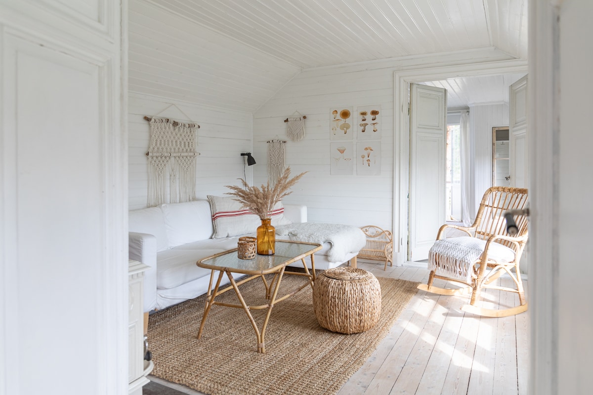 Charming 130-year-old cottage (90 m²) with a modern yet cosy feel. Two renowned spas (Yasuragi & Skepparholmen) within walking distance. Bottom floor: kitchen and dining area with classic wood stove, living room and bathroom. Your own garden and spacious wooden deck—perfect for sunbathing or BBQs. Set in a beautiful area with a crystal-clear lake for bathing just 200 m away, with a nature reserve surrounding it. Sea dock ~700 m. 30 minutes to Stockholm by Waxholm boat, bus or car.