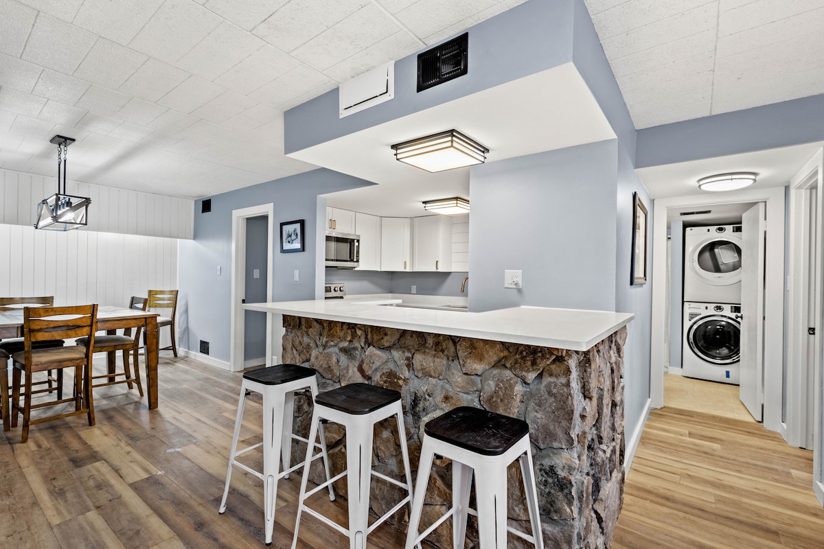 ¡El condominio acaba de ser renovado con nuevos armarios, electrodomésticos, encimeras de granito, lámparas, pintura y muebles! Es un condominio de 2 habitaciones y 2 baños en el monte. Barrio de villas de 7 Springs. ¡Está justo enfrente del campo de golf y puedes caminar hasta la casa club y el primer hoyo para salir! Tiene una bañera de hidromasaje privada al aire libre y una piscina comunitaria y un parque infantil. ¡Está justo al lado de una parada de transporte que te llevará a las pistas, al alojamiento principal, al tiro de arcilla y a todos los demás destinos del centro vacacional!