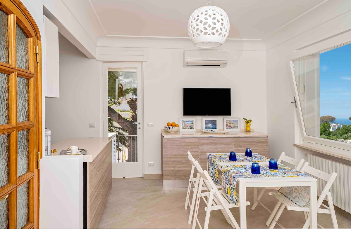 Giulia Suite offers a queen size bed and a private bathroom for comfort and privacy. Enjoy the balcony with a view of Positano. Equipped with a smart TV and air conditioning, the room ensures entertainment and a pleasant atmosphere. A mini-fridge is available for convenience, and fresh towels are provided daily.