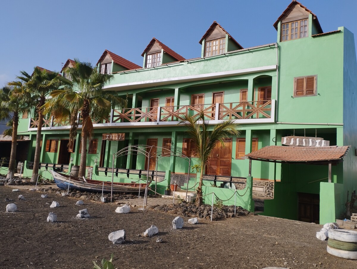 Profitez de ce logement comprenant un salon donnant sur une cuisine ouverte, 1 chambres, 1 salle de bain avec son WC. Le tout avec un accès à la terrasse sur le toit au 3ème étage. Au cœur de l'île de Santiago, à Assomada, vous serez à equidistance de Praia, la capitale, de Tarrafal, la commune en bord de mer et de tous les axes de l'île. Vous pourrez visiter sur place l'arbre le plus grand de l'archipel "Peî de Polom". Possibilité de coupler 2 logements pour un séjour en groupe (12 pers)