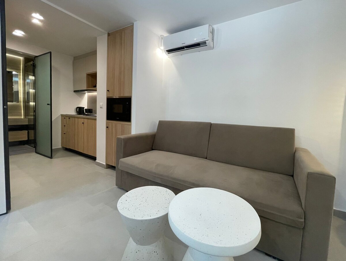 Un pequeño ático, de unos 30 metros cuadrados, con una cama doble con sofá doble, mesa de comedor, nevera, kitchenette, limpio y cómodo, muy adecuado para parejas, con una terraza privada extra grande para disfrutar del cálido sol griego, lo único es que mi lugar está en el quinto piso, mientras que el ascensor solo llega al cuarto piso, por lo que subir un piso a pie