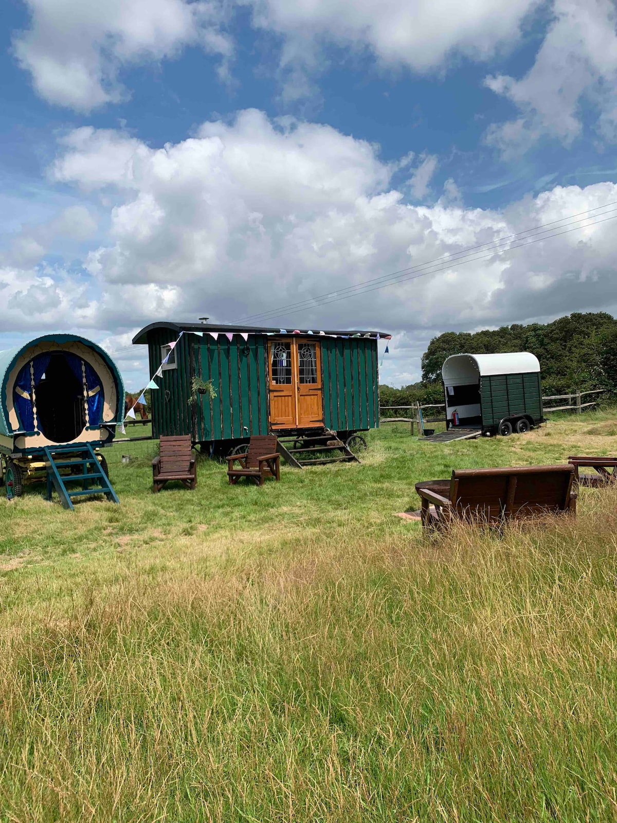 Discover the gorgeous outdoors surrounded by nature . the Shepard’s hut is cosy ,perfect for a relaxing getaway, 4ft double bed . bedding provided . compact kitchen area , additional use of Gypsy wagon ,very basic which has a 4ft mattress ,bedding can be provided . The toilet is in a converted horse trailer .new shower and toilet a short walk away. surrounded by farmland , sheep,chickens & horses . access to 80 acres of walks on our own farmland . Dogs must be kept on a lead .