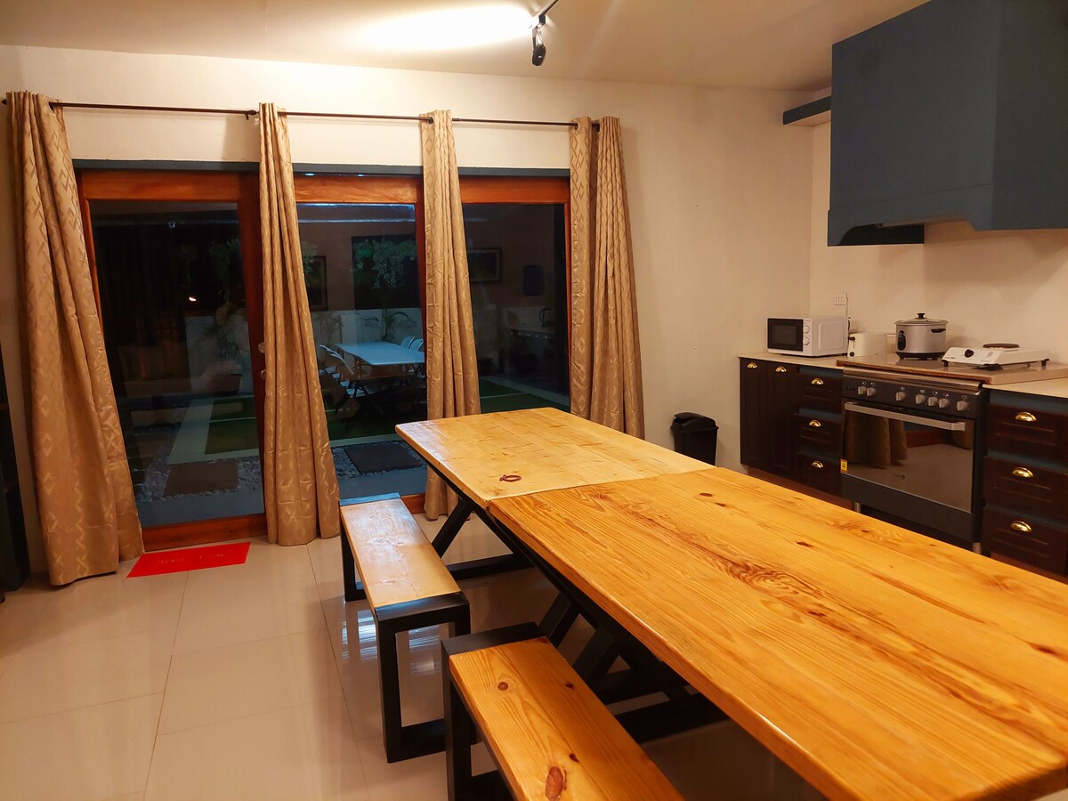 Tómate un descanso y relájate en esta propiedad minimalista de 100 metros cuadrados. Nuestra pequeña casa es toda tuya para disfrutar con amigos y familiares. Tiene una piscina pequeña, de cuatro pies y medio de profundidad, la otra mitad es de dos pies para que los niños naden. La propiedad cuenta con cocina al aire libre y comedor donde podrás relajarte y ver Netflix mientras comes. Hay un bar al aire libre para disfrutar de tus bebidas. El dormitorio tiene 3 camas tamaño queen, totalmente climatizado. No es un hotel de cinco estrellas. Esta es una estancia en casa.