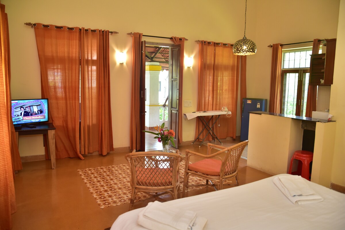 Esta villa estudio decorada con buen gusto y ubicada en Cavelossim cuenta con una gran sala de estar con cama doble y cocina. La sala de estudio está equipada con todos los electrodomésticos que necesitas, incluida una nevera, TV, microondas y aire acondicionado con energía de respaldo. También hay un acogedor asiento exterior para disfrutar de un café por la noche con un libro. Hay tumbonas en el césped para leer y tomar el sol sin parar. Tenemos 2 piscinas en la comunidad que puedes utilizar.