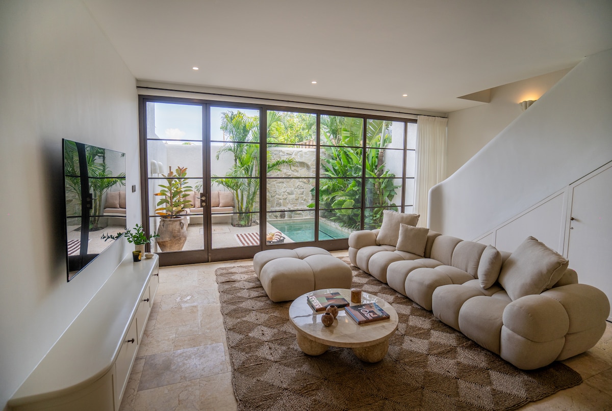 Las puertas correderas del suelo al techo crean una armonía interior-exterior, haciendo que la transición desde tu piscina privada, sauna exclusiva y amplio salón sea perfecta. Una cama suntuosa captura los dulces sueños del día pasado y un baño decadente con una bañera para morirse de ganas de hundirse en ella te espera. Crea recuerdos mientras contemplas la magnífica puesta de sol de Bali en tu terraza privada en la azotea antes de compartir conversaciones íntimas en el relajante comedor.