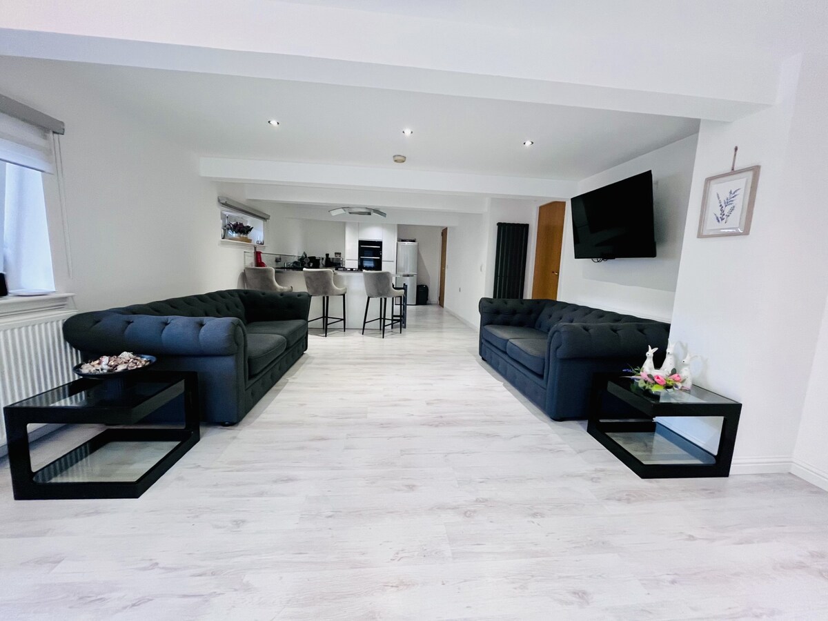 A unique luxury villa close to the town centre & motorway links to Glasgow This incredible home has a custom built high spec Cinema room. 3 large bedrooms (1 en-suite) all with king size beds Beautiful freshly decorated living area with 85āā TV & huge electric built in fireplace. Dining area in hallway with seating for 6 Open plan kitchen with table and chill out area, bifolding doors that overlook the outdoor seating area Built in coffee machine Dishwasher Washing machine Wine fridge