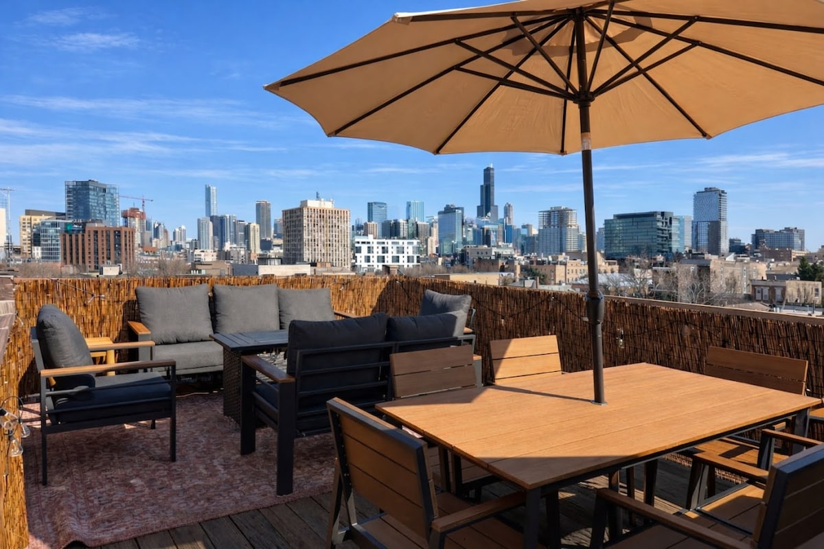 Welcome to your stylish retreat in vibrant PILSEN! This modern apartment offers garage parking, a rooftop with stunning views of Willis Tower, and a cozy firepit for relaxing evenings. Explore the neighborhood's murals, visit local bars like Simones, and enjoy Sunday brunch at Duseks. Catch a concert at Thalia Hall or sing your heart out at karaoke bars nearby. Experience the best of art, food, and entertainment in PILSEN – book your stay now!