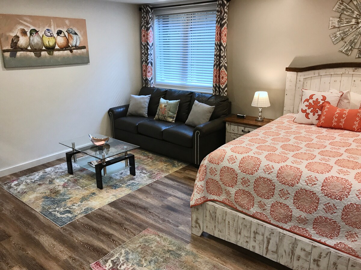 ¡Tu propio campamento base en Teton con aire acondicionado LG NUEVO! - ¡Capacidad para 5 personas! Recién remodelado. ¡ENORMES techos de catedral! Dormitorio principal bien equipado + 2ª cama/sala de estar (TV inteligente de 40 pulgadas y nuevo sofá en forma de L) + baño completo espacioso/privado. ¡Mucha luz con vistas a la montaña! ¡Este espacio RESPIRA vida moderna, occidental y saludable! Nuevo colchón tamaño king de lujo Stearns & Foster en el dormitorio principal y 2 camas individuales tamaño XL Temperpedic en el segundo dormitorio. ¡Escritorio de trabajo para nuestros huéspedes nómadas! Servicio de café, microondas, mininevera y plato + tazón + cubiertos.