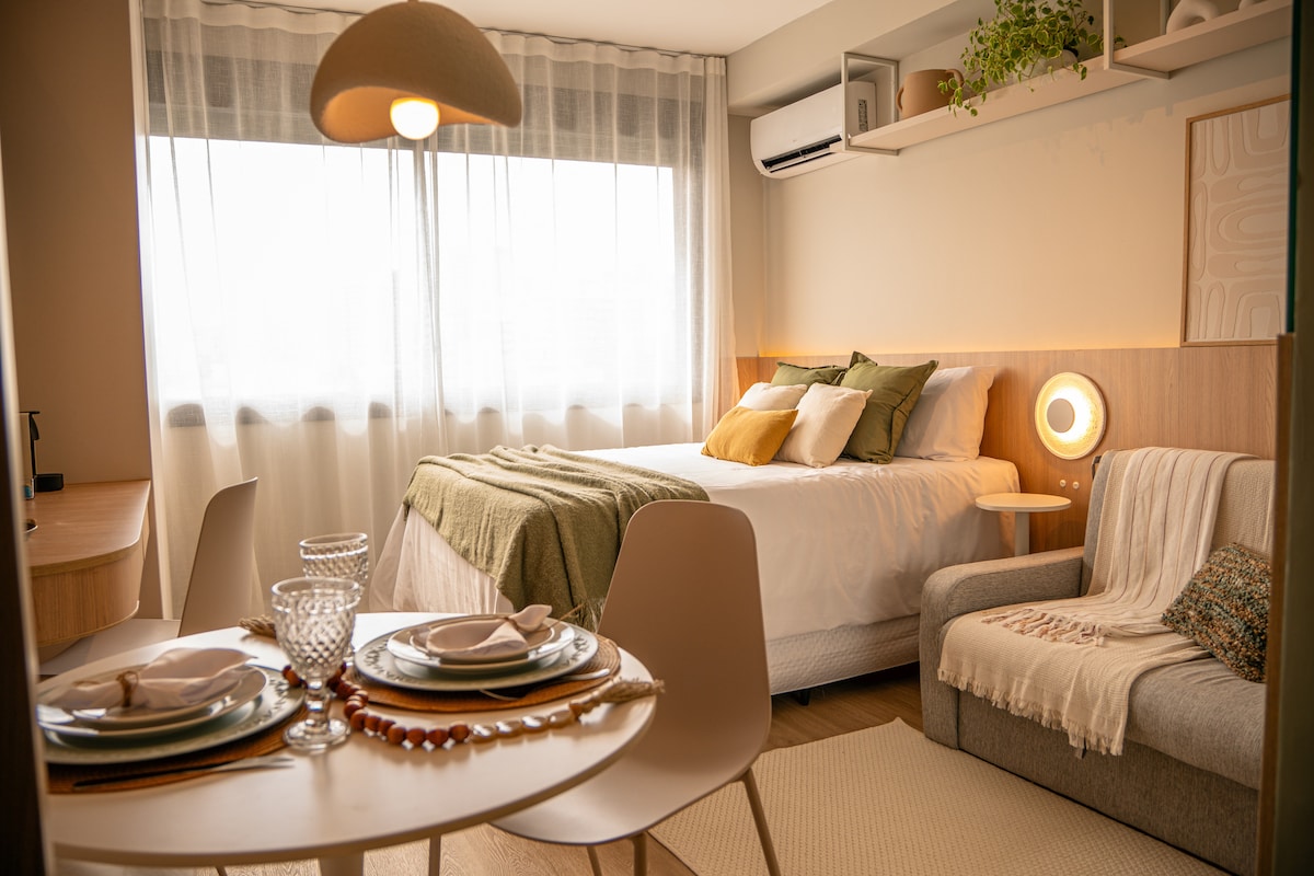 Estudio moderno, nuevo, acogedor, ubicación perfecta, con una hermosa vista desde el balcón, especialmente por la noche. Wifi rápido, escritorio, TV inteligente de 55”, cama Queen. Aire acondicionado (frío/calor). Lavadora y secadora y una hermosa isla en la cocina. 50m2 de mucho estilo-27ºandar, Silencioso. En el Centro/Batel, cerca de comercios, bancos, centros comerciales, polo gastronómico y Hospital. En el edificio: piscina, gimnasio, sala de juegos, sauna, jacuzzi, conserjería las 24 horas.