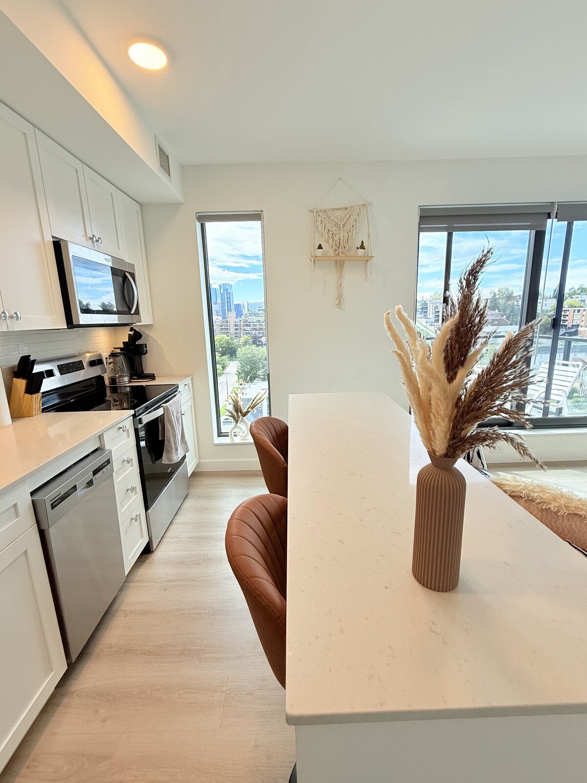 - Amplio apartamento de 1 dormitorio con techos altos. - Cama tamaño king con muchas almohadas. - TV de 55 pulgadas con Apple Play. - Wifi rápido. - Cocina totalmente equipada. - Aparcamiento subterráneo. - Vista preciosa del horizonte de la ciudad de Calgary. - Situado en Inglewood, encontrarás cervecerías locales, cafeterías, restaurantes de primera, música en vivo y tiendas. - ¡El río Bow, a pasos de tu puerta! - A poca distancia a pie de los terrenos de Stampede. - Podrás ver los fuegos artificiales desde el patio.