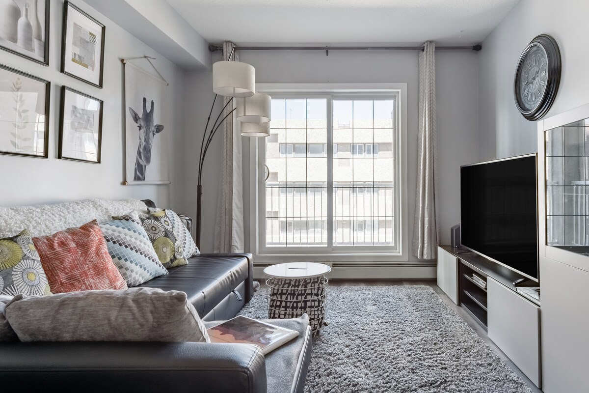 ✨ ¡Disfruta de lo mejor del centro de Calgary en este elegante apartamento junto al río Eau Claire! A pocos pasos del sendero del río Bow, de cafeterías de moda, restaurantes y de las principales atracciones como la Torre de Calgary, el Stampede Park y el Puente de la Paz. Disfruta de la comodidad moderna con aparcamiento gratuito, Netflix, acceso al gimnasio, wifi de alta velocidad y un pase GRATUITO para el Parque Nacional Banff. Perfecto para parejas, viajeros de negocios y familias que buscan estilo, comodidad y relajación. 🌿